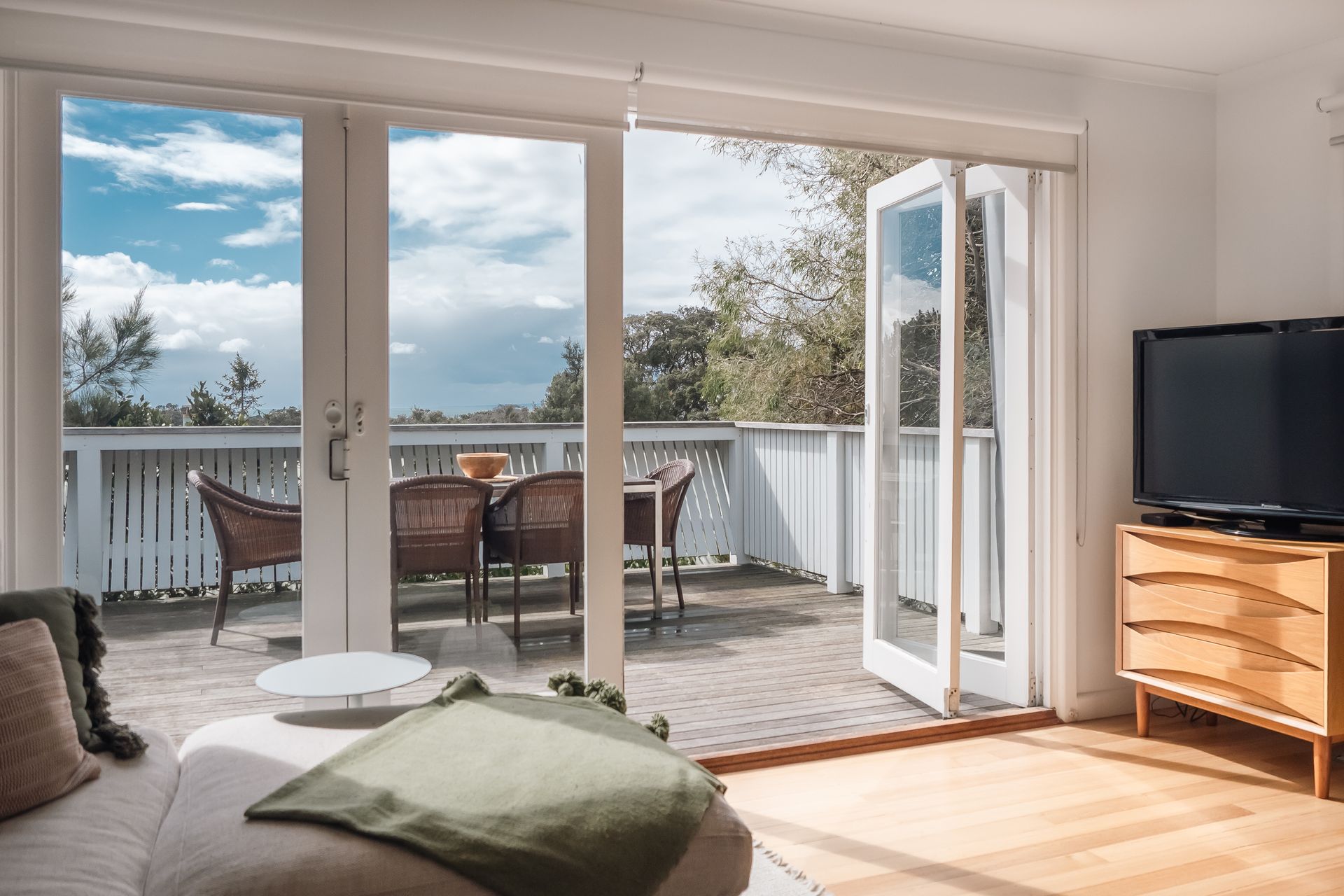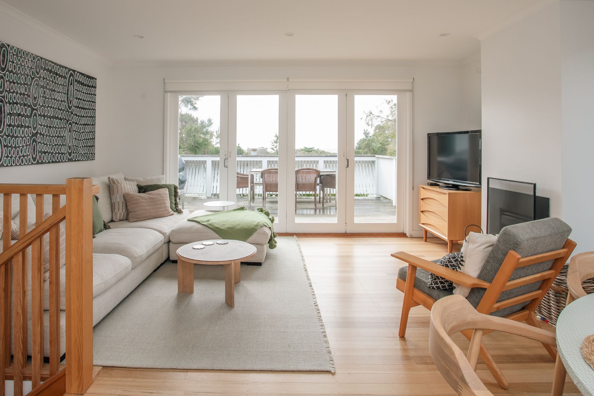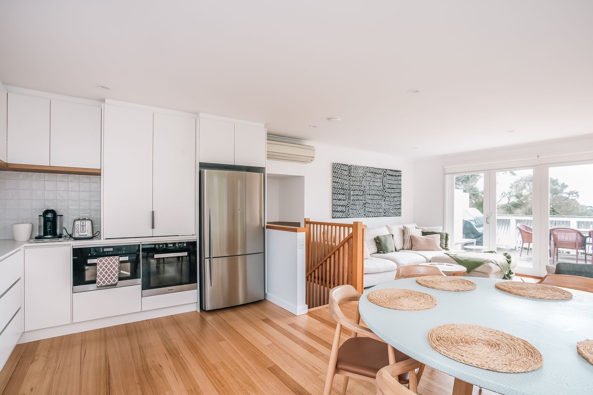 Spread over three levels and stylishly refurbished for superb holiday living, rejoice in this premier position close to the sailing club and only a couple of minutes from restaurants and boutiques, golf courses and beaches. With echoes of the past, the entry level includes a large master bedroom , a walk in robe and en suite, while two other bedrooms include built in robes and share the main bathroom. A short flight of stairs leads up to the main living area and a cleverly designed kitchen with stainless steel cooking appliances and an open fireplace that keeps things cosy in winter, along with a split system. Upstairs also includes a wide balcony that basks in northerly sun with sea views and a large picture window framing a view of the rear garden. The lower level offers a second living area with TV, with French doors onto a garden deck which opens out to the back yard with a generous size trampoline.