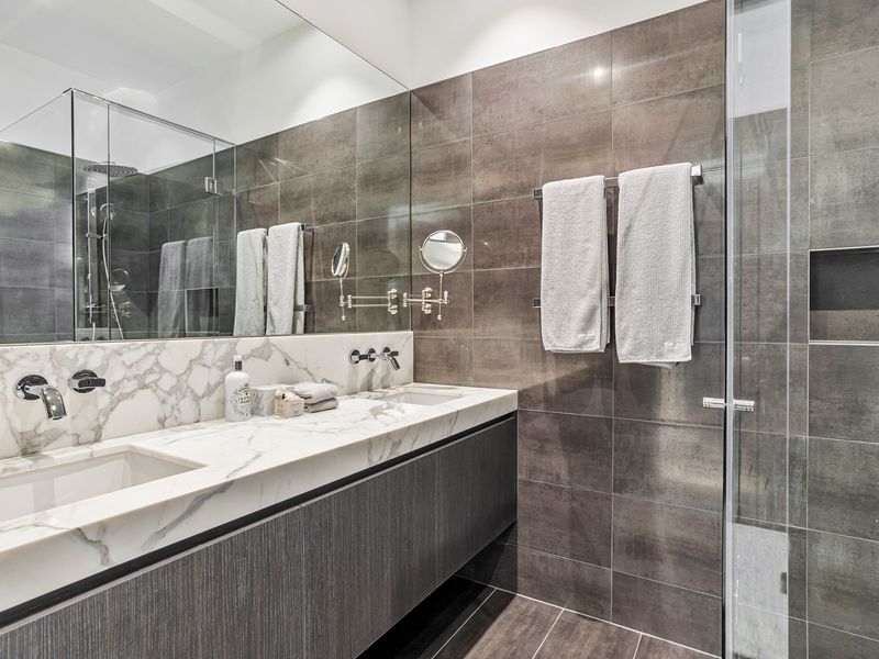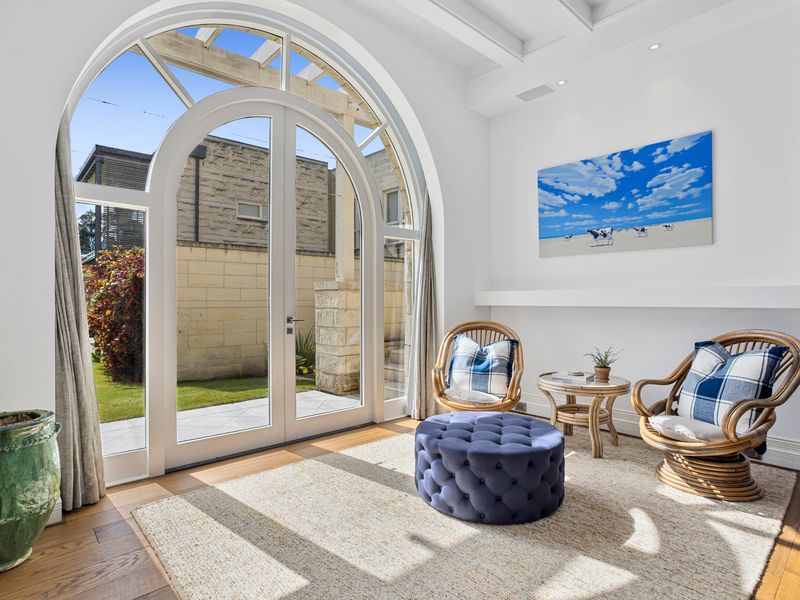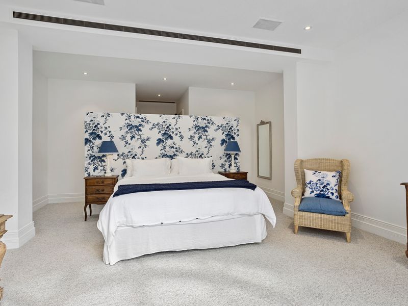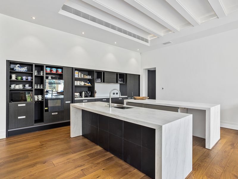 Two waterfall marble islands head a suite of quality integrated appliances (including a Miele dishwasher, 2x Miele refrigerators, Miele induction cooktop and dual Zug ovens), further complemented by specialty auto-touch cabinetry and concealed butlers pantry. Breathtaking oversized arched doors frame the beautiful views over the sprawling North facing lawns toward the golf course and bay, conceiving a relaxed estate ambience without the maintenance.