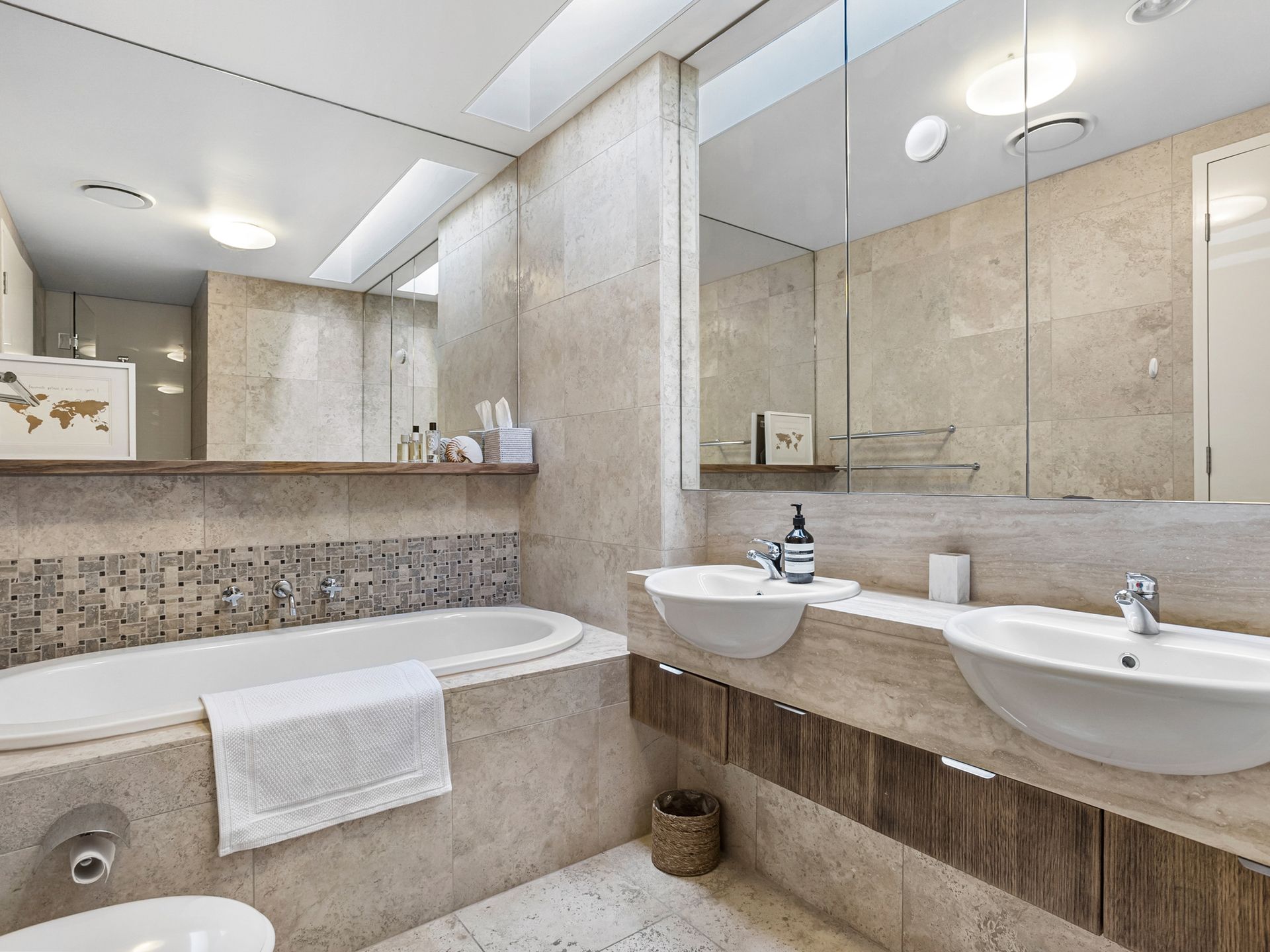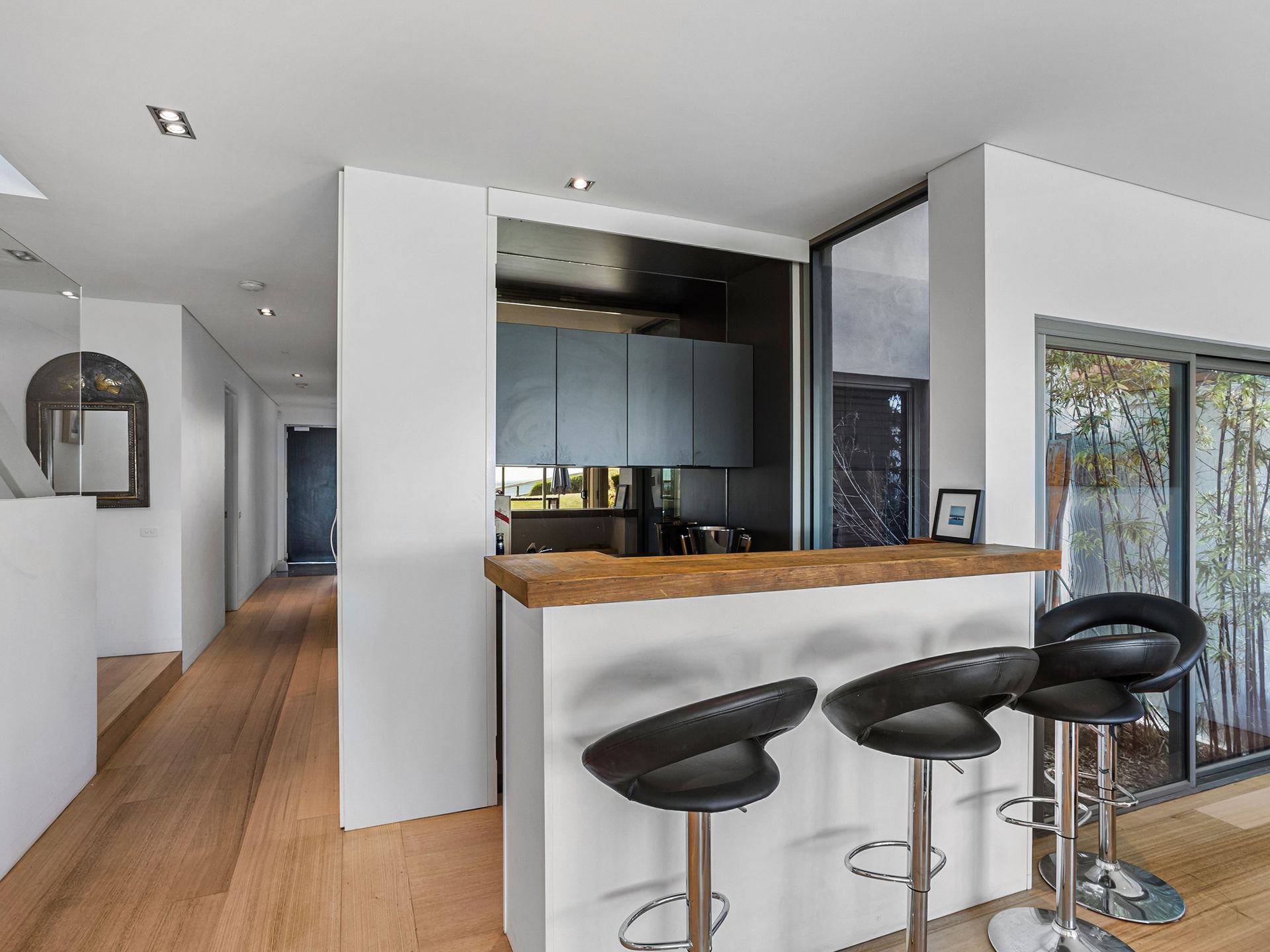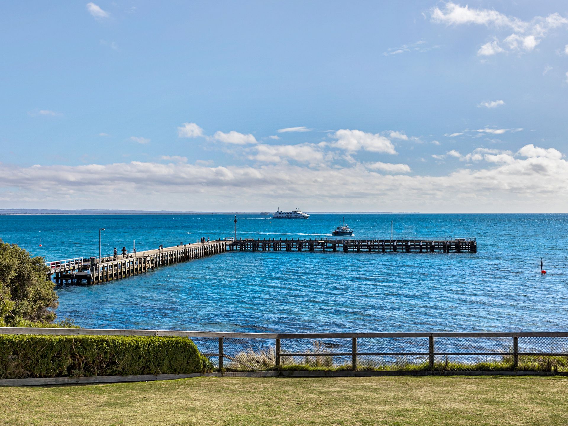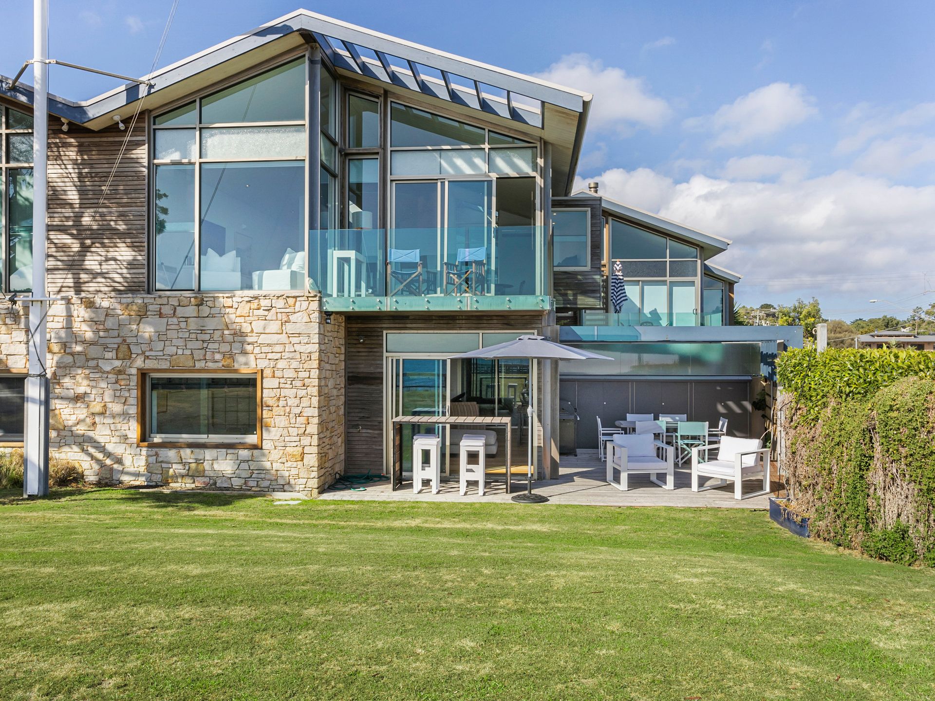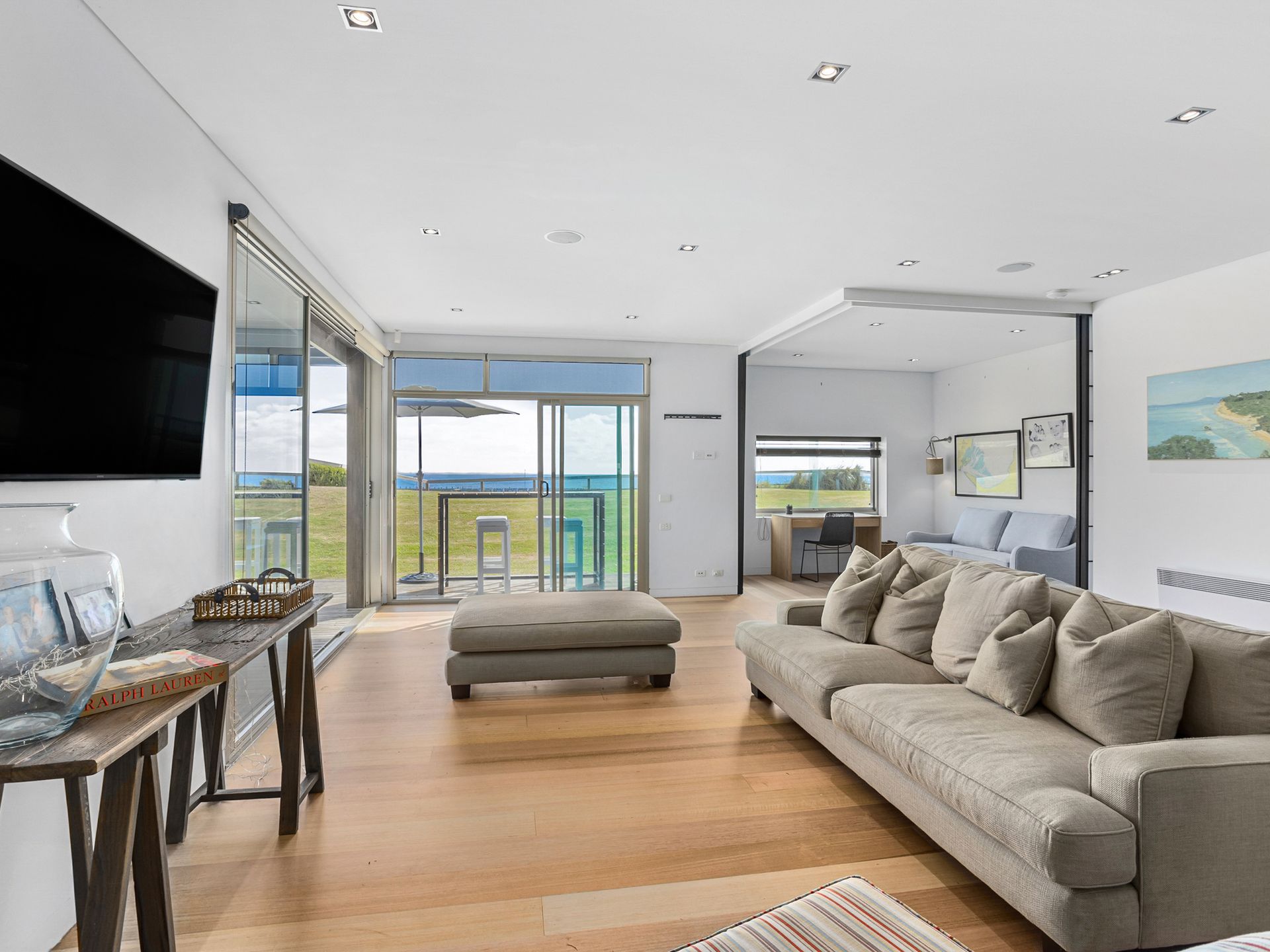 2 living areas, 1 with smart tv / Foxtel, plus downstairs a bar and living area with smart tv that opens to a 3rd outdoor entertaining area with BBQ, Bar and table seating, opening onto the lawn that overlooks the Portsea pier. This is beachside land and can have people walking past.